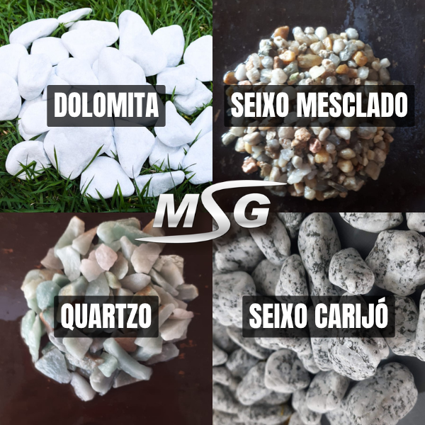 Dolomita, Quartzo Rosa, Quartzo Verde, Seixo Mesclado e Seixo Carijó entre outros. (Confira no catálogo) Acabamentos para jardins, caminhos e canteiros.